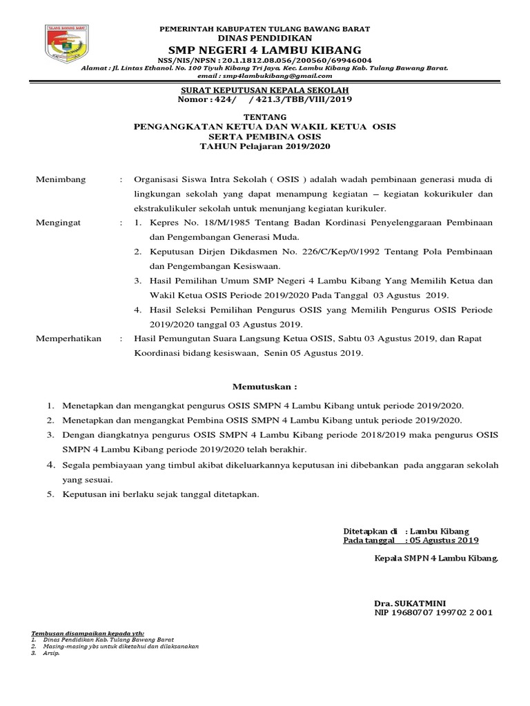 Dengan diangkatnya pengurus osis smpn 4 lambu kibang periode 2018/2019 maka pengurus osis smpn 4 lambu kibang periode 2019/2020 telah berakhir. Susunan pengurus osis tahun pelajaran 2017/2018, sebagai berikut : Sk pengurus osis 2011 pdf document. Pastikan baca sampai selesai ya, karena ada informasi penting buatmu! Please fill this form, we will try to respond as soon as possible.