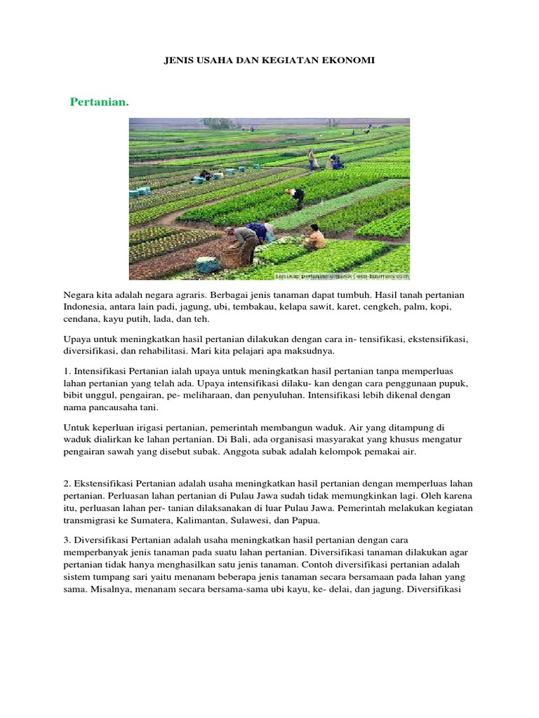 1) bidang usaha ekstraktif, adalah kegiatan produksi yangbergerak di bidang pengambilan atau pemanfaatanlangsung sumber daya alam tanpa diolah terlebih dahulu.misalnya, produksi pertambangan, perburuan binatang, penangkapan ikan di sungai, dan penebangan hutan. Konsep lahan pertanian berupa perkebunan merupakan salah satu jenis usaha bidang angraris yang cukup luas dan biasanya terletak di daerah kawasan tropis atau subtropis yang kerapkali dipergunakan untuk menghasilkan komoditas perdagangan berupa bahan dalam arti pertanian dalam skala besar serta akhirnya mampu untuk dipasarkan ke tempat yang jauh, oleh karena itulah hasil perkebunan termasuk. Macam budidaya secara umum dan contohnya. 1.sawah sawah adalah suatu bentuk pertanian yang dilakukan di lahan basah dan memerlukan banyak air baik sawah irigasi, sawah lebak, sawah tadah hujan maupun sawah pasang surut. Semoga resolusi tahun ini bisa tercapai, dan bisa jauh melampaui pencapaian tahun lalu, aaamiiin.